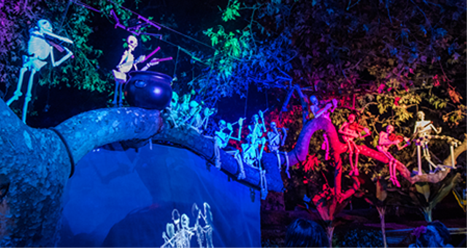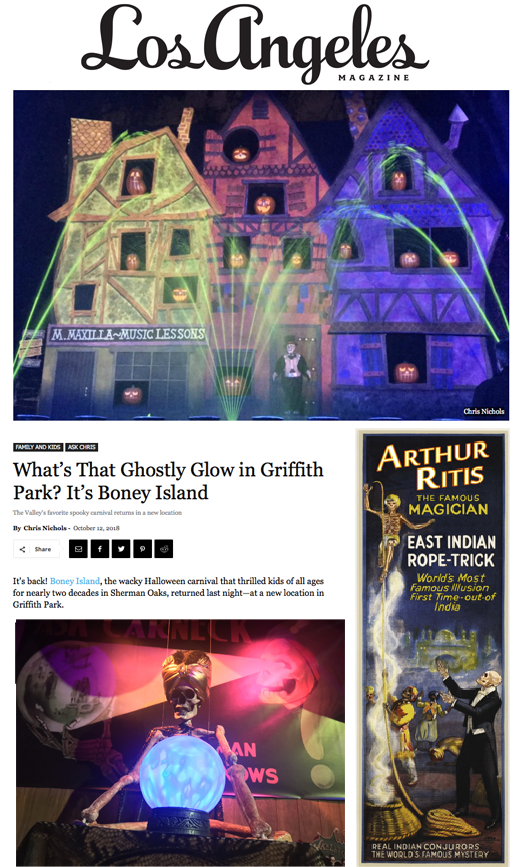 FOR THE LAST TWO WEEKS IN OCTOBER, RICK POLIZZI BECOMES THE WIZARD OF AAHS. Oohs and aahs are what he gets when visitors check out Boney Island, his Halloween extravaganza that’s more interactive carnival, than drive-by display. “I always wanted to design rides. This is like my walk-through ride,” says Polizzi, animation producer and Emmy Award winner for The Simpsons. Every year he spends about four months and between $5,000 and $7,000 turning his front yard in Sherman Oaks, California, into a haunt for some hip and – literally – swinging skeletons. It didn’t start out that way. His original display, seven years ago, was rather bare bones. “I found these inexpensive skeletons that I thought I could pose and do something with,” Polizzi says. “It just took off from there.” Tapping into his rich imagination, animation background and love of Mardi Gras, the New Orleans native began enhancing his skeleton crew with personality, action and humor, adding motors and audio tracks. The result? Plenty of tricks and treats. “I hate making anything gory,” Polizzi says. “I wanted to do something everybody could enjoy.”